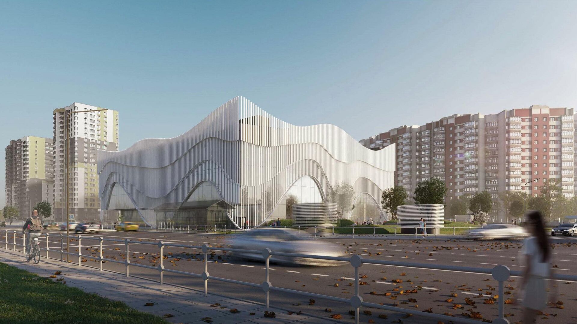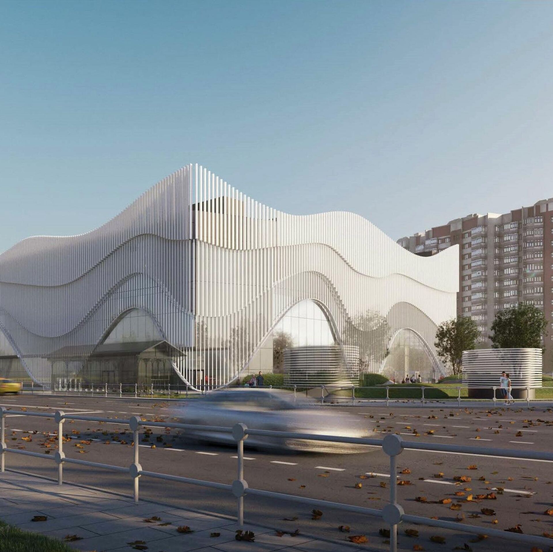 "Здание будет иметь "двойной" фасад. Внутренний слой облицуют матовыми сэндвич-панелями темно-серого цвета, а сверху их дополнят декоративными конструкциями из белых ламелей. Они создадут живописные волны, которые постепенно будут расширяться к уровню кровли. Витражное остекление дополнят непрозрачным стемалитом графитового оттенка", – цитирует пресс-служба главного архитектор столицы Сергея Кузнецова.