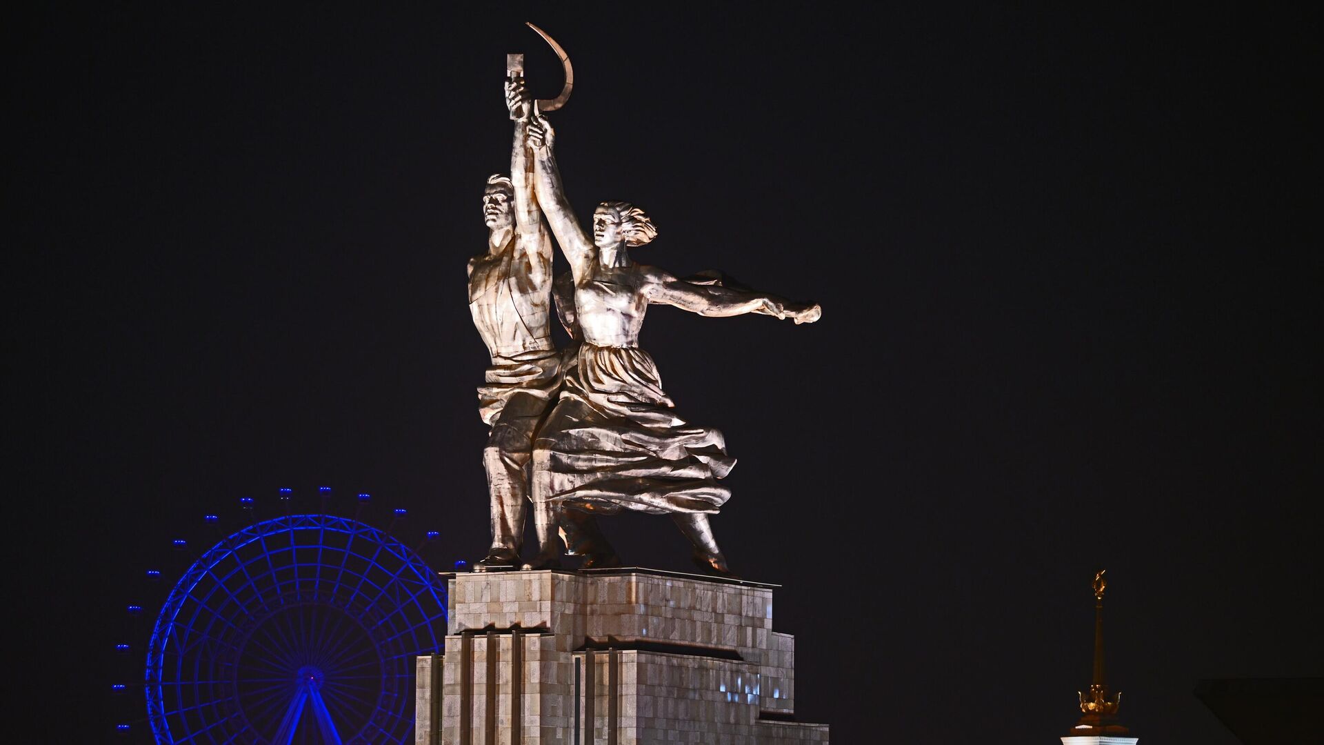 На крыше павильона установлен памятник "Рабочий и колхозница". Впервые мир увидел произведение Веры Мухиной на Всемирной выставке 1937 года в Париже. Скульптура была выполнена из специально разработанной тонколистовой коррозионностойкой стали (высота 24,5 метра от основания до верхней точки). Памятник установили на постаменте, которым служила башня павильона высотой 35 метров.